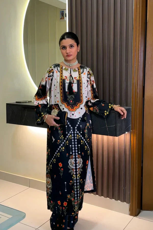 A rich winter velvet suit featuring a contrast bodice and refined digital motifs for a polished, evening-ready look. Soft, warm, and effortlessly stylish for the season.